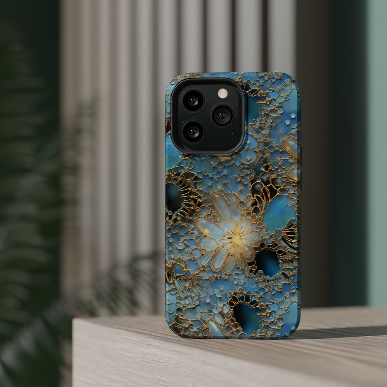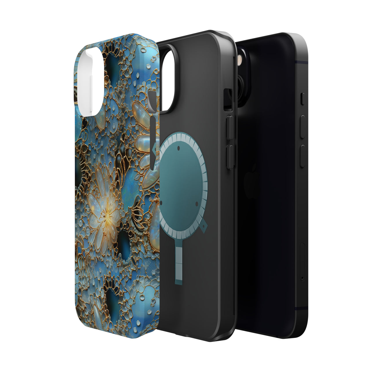 Gemstones and Gold Lace MagSafe Tough Cases for iPhone 13, iPhone 13 Mini, iPhone 13 Pro, and iPhone 13 Pro Max.