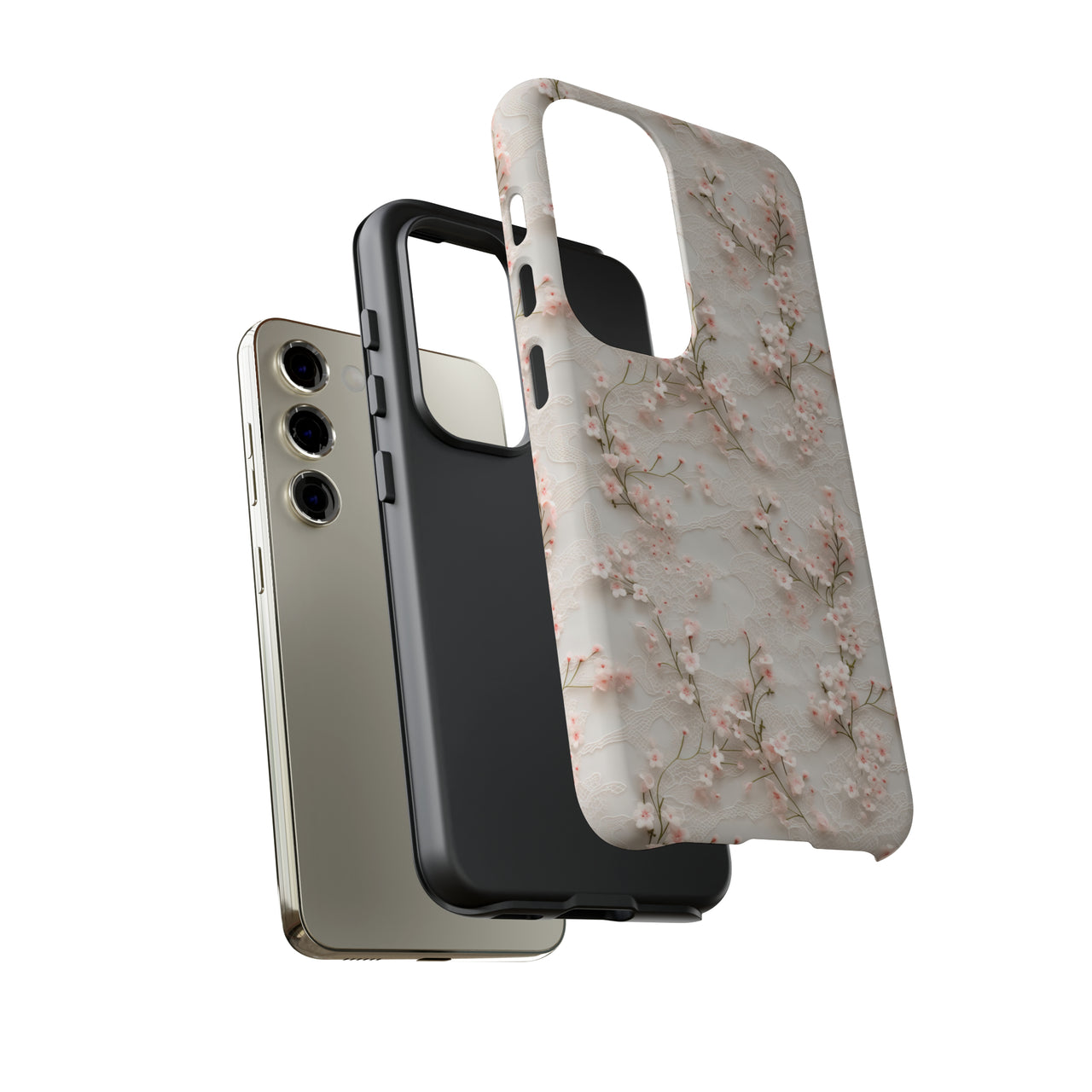 White Lace and Cherry Blossoms Tough Cases for Samsung Galaxy S23, Samsung Galaxy S23 Plus, and Samsung Galaxy S23 Ultra